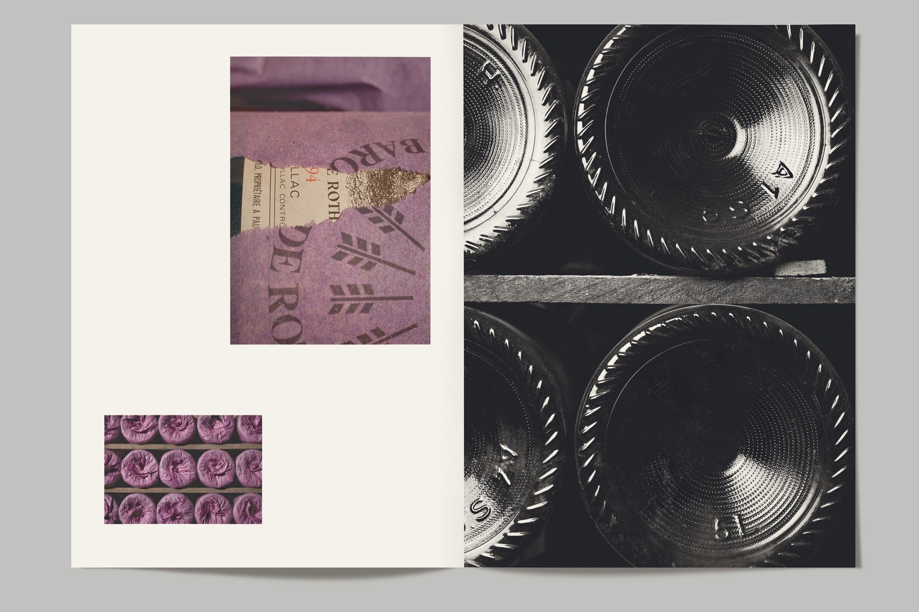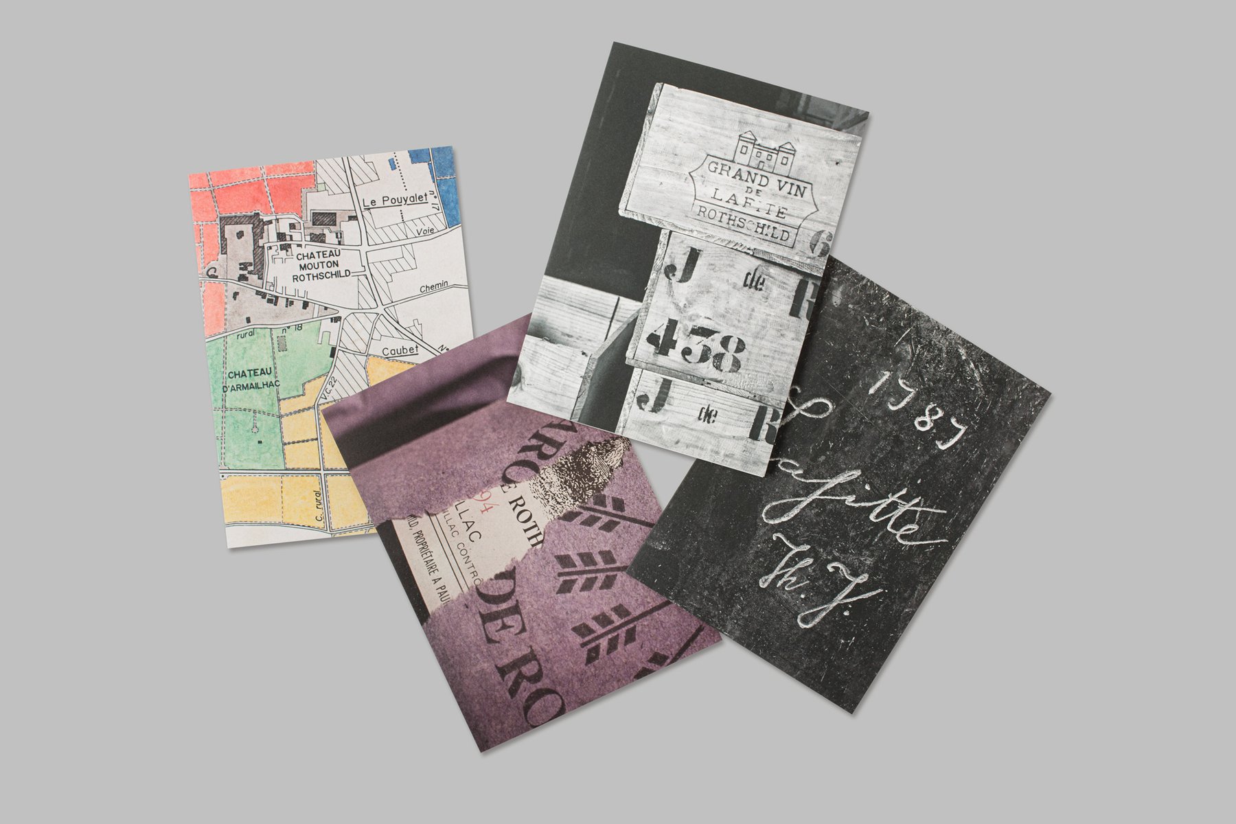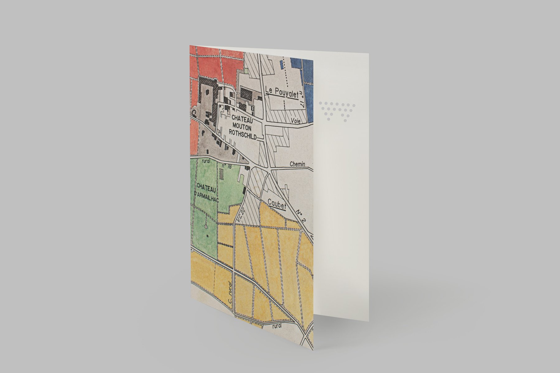 A pair of Rothschild’s greatest wines: Château Lafite and Château Mouton were individually wrapped in vintage maps of their respective vineyards.